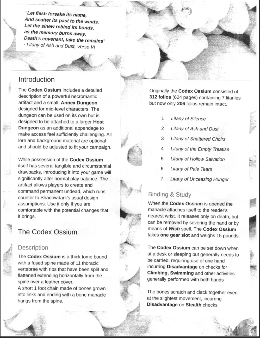 Codex Ossium is a necromantic artifactand an Appendix Dungeon for Shadowdark and other classic fantasy systems. The Codex Ossium is a chained tome of vertebrae and leather that lets its owner assemble permanent skeletons, grow a cancerous bone annex beneath the earth, and whisper dark answers but at a price. Use the artifact alone or drop the included Annex of Bone onto any existing dungeon as a hostile side-complex with its own agenda.