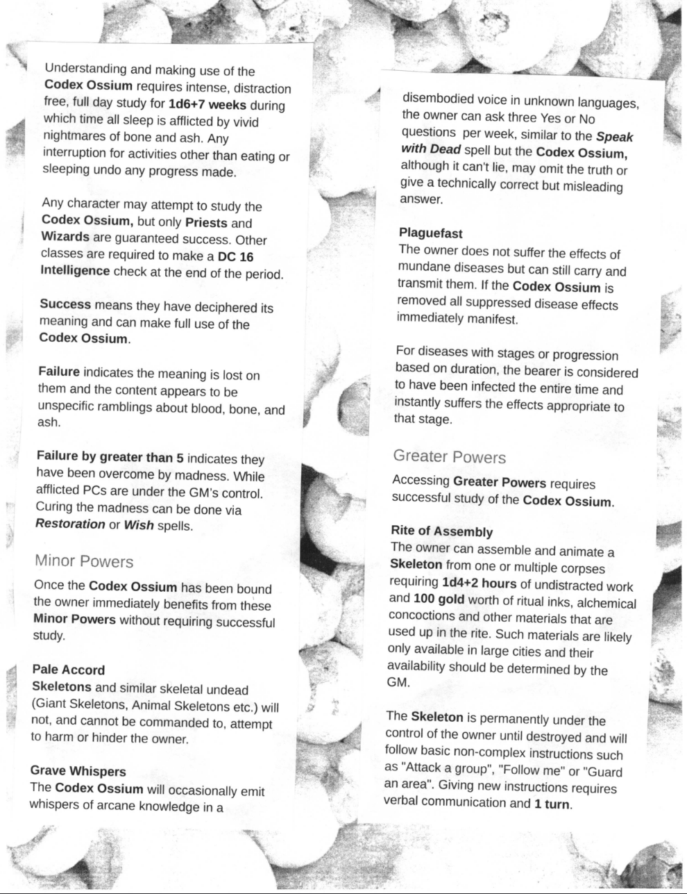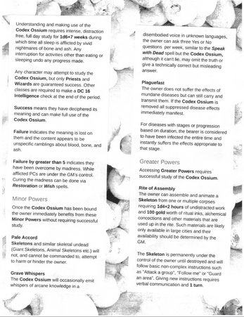 The Codex Ossium ( Necromantic Artifact): binding rules, study requirements, minor and greater powers (e.g., Rite of Assembly for permanent skeletons), and escalating drawbacks (hunger, divine rebuke, sanctity restrictions, destruction conditions).