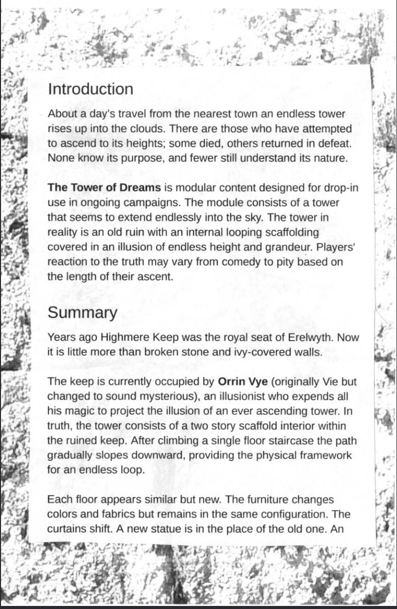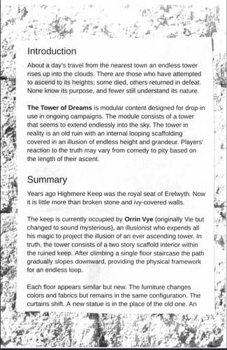 The Tower of Dreams is designed for low-level characters and quick prep. It works as a drop-in site, one-shot, or eerie diversion during overland travel.