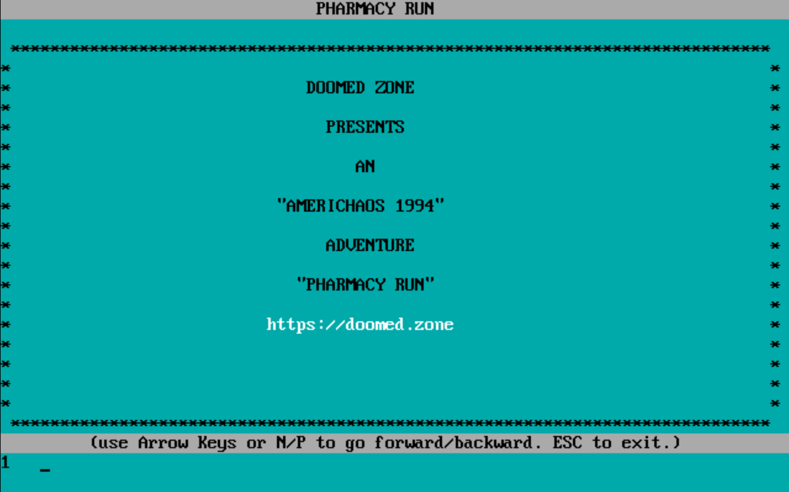 Pharmacy Run is a third-party adventure module for the obscure tabletop RPG Americhaos 1994, originally distributed as BBS shareware.